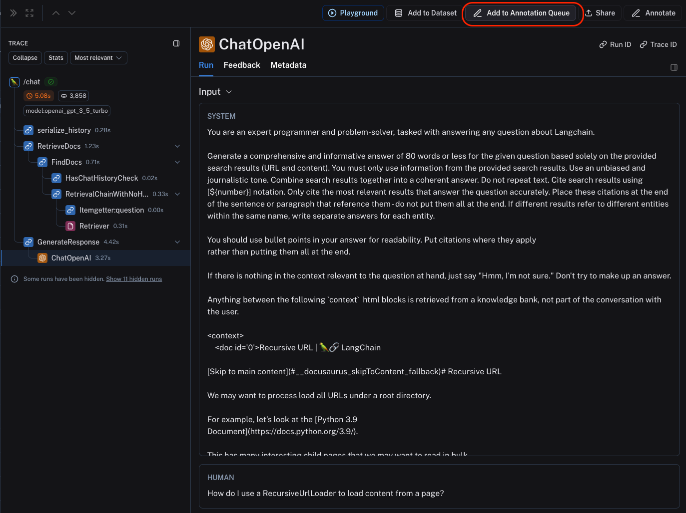 Click on Add to Annotation Queue in top right corner of any trace view. You can add ANY intermediate run (span) of the trace to an annotation queue, not just the root span.