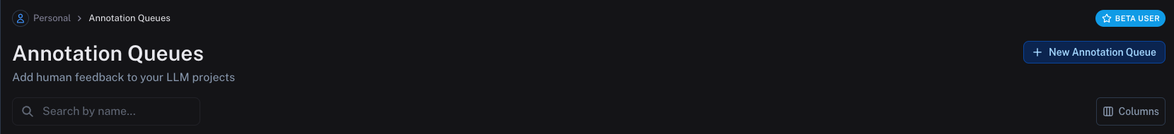 To create an annotation queue, navigate to the Annotation queues section through the homepage or left-hand navigation bar. Then click + New annotation queue in the top right corner.