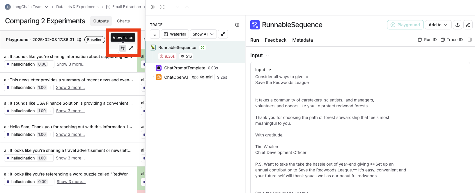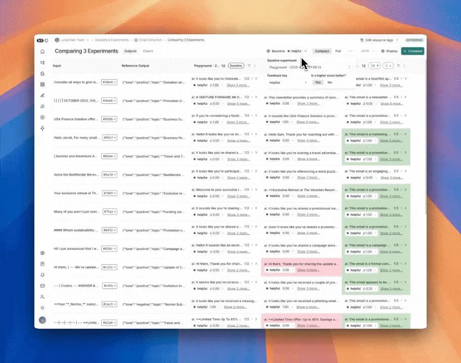 LangSmith supports a powerful comparison view that lets you hone in on key differences, regressions, and improvements between different experiments.
