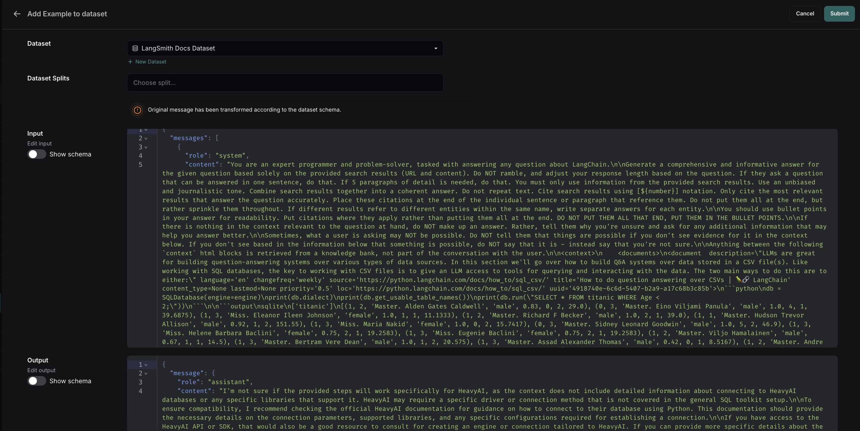If you plan to collect production traces in your dataset from LangChain ChatModels or from OpenAI calls using the LangSmith OpenAI wrapper, we offer a prebuilt Chat Model schema that converts messages and tools into industry standard openai formats that can be used downstream with any model for testing. You can also customize the template settings to match your use case.