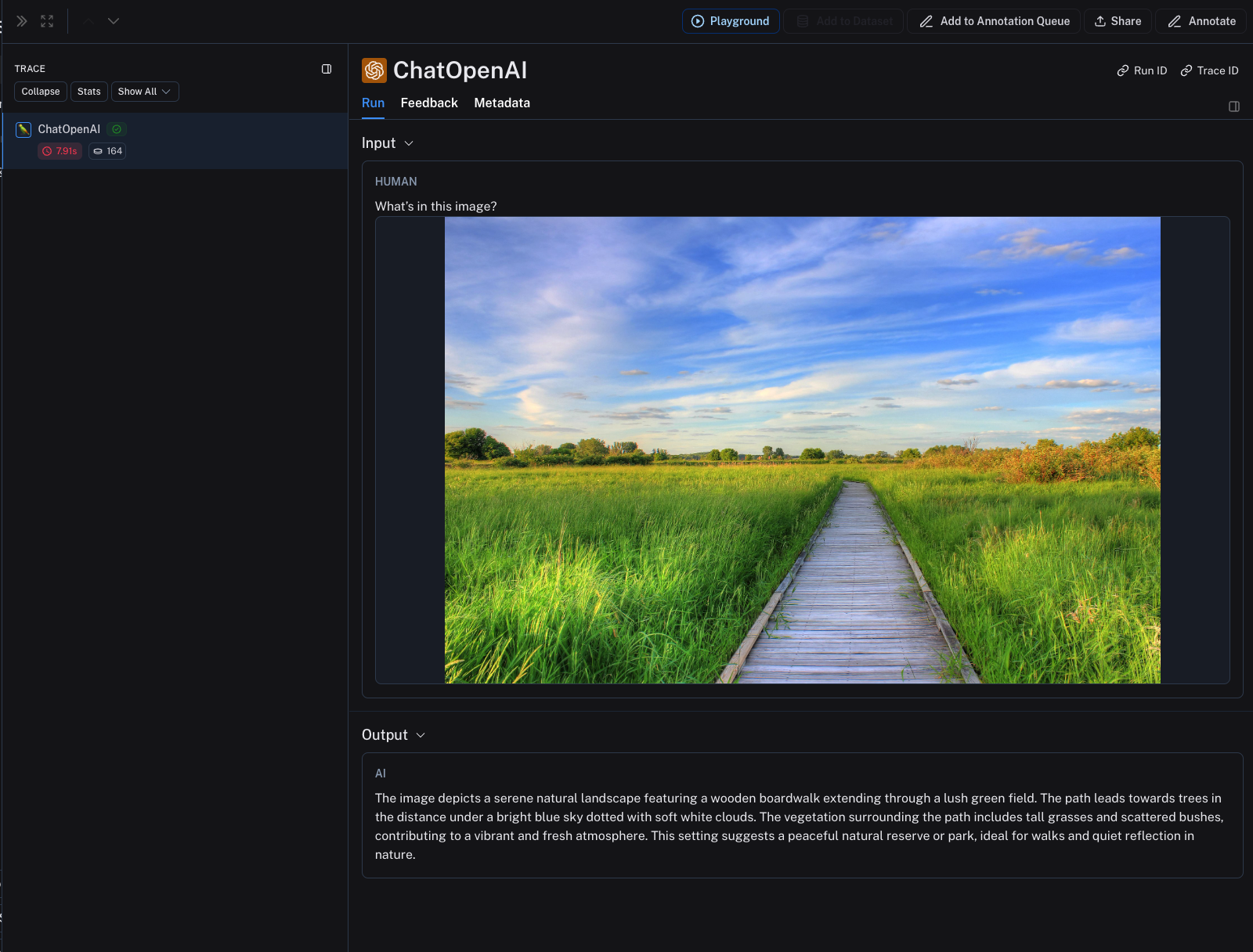 LangSmith supports logging and rendering images as part of traces. This is currently supported for multimodal LLM runs.